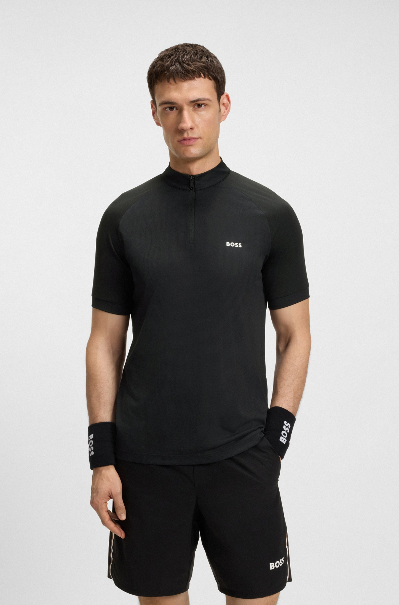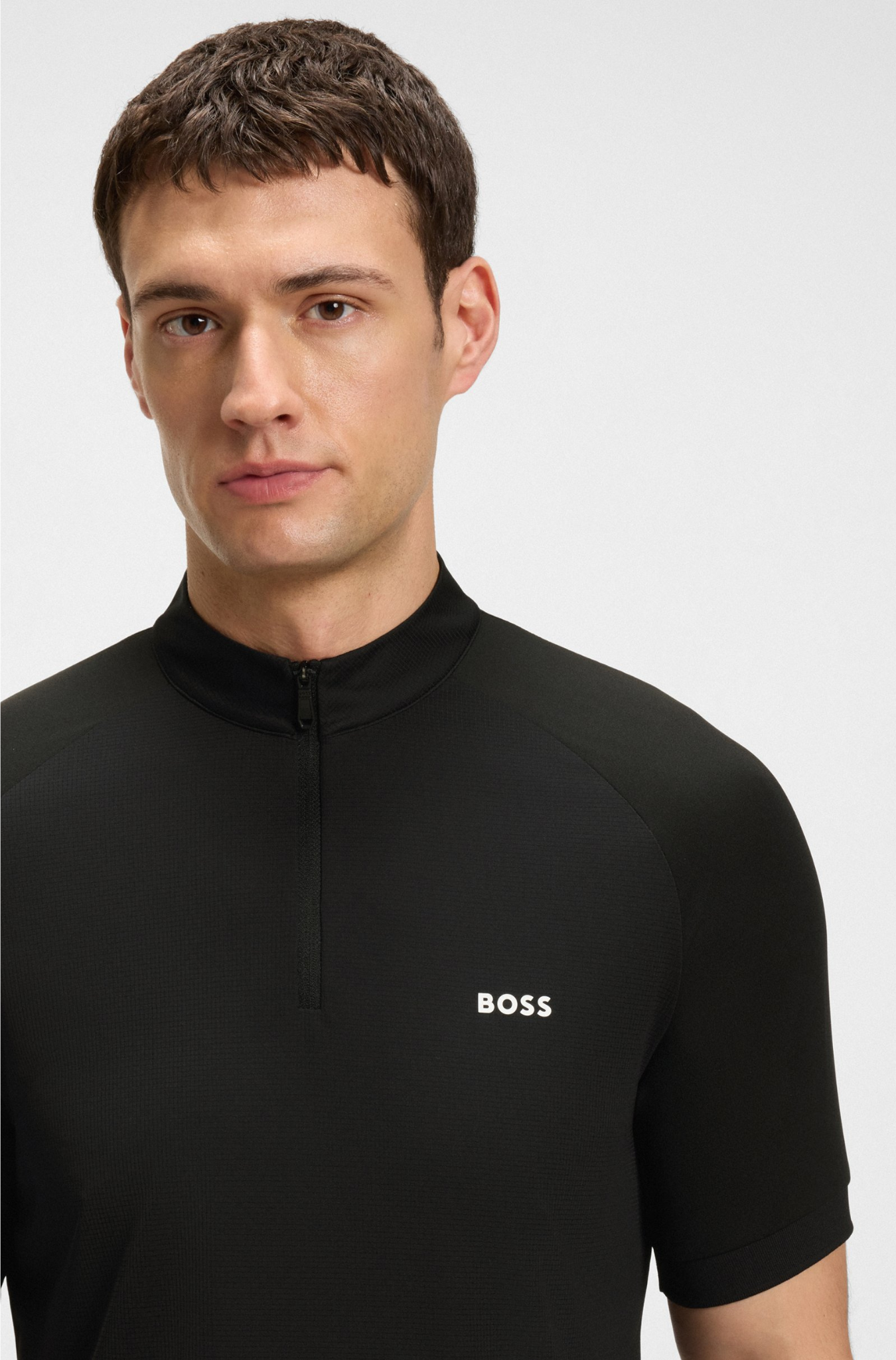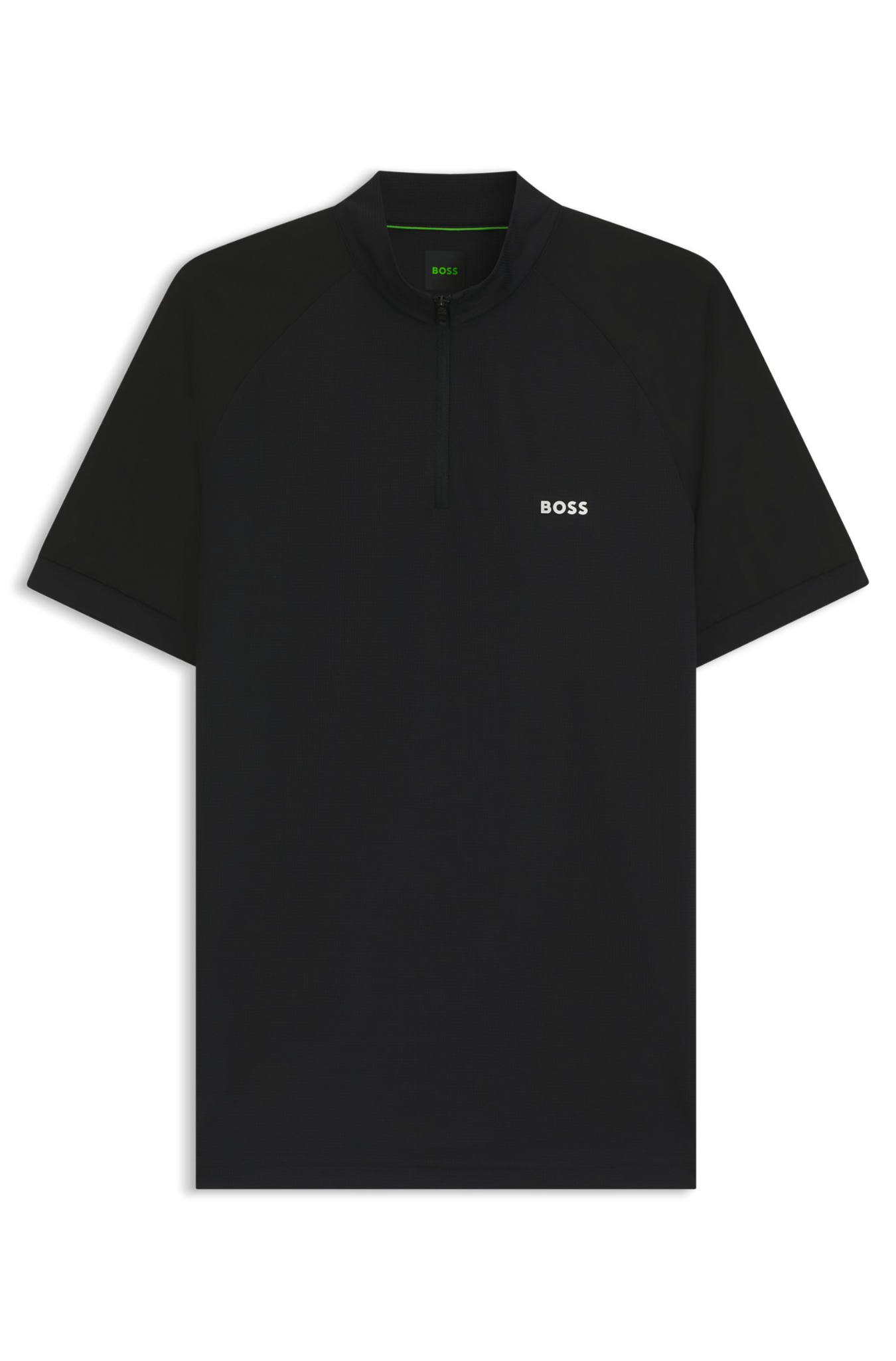 חולצת ספורט מודרנית מבית הוגו בוס לימים של פעילות אקטיבית. גזרת סלים פיט, חצי זיפר, בד נמתח וקליל שגם מנדף זיעה ומתייבש מהר