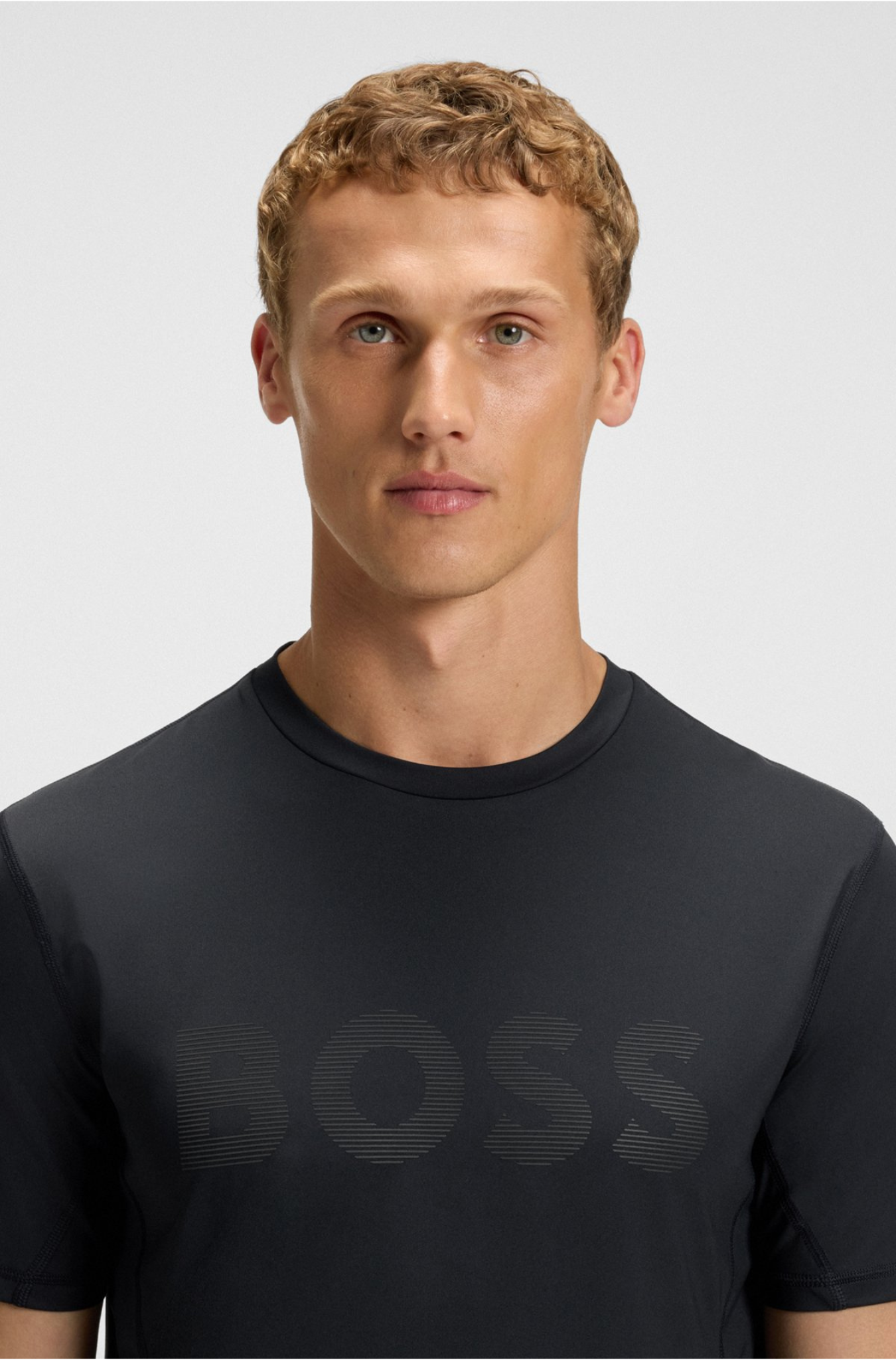 חולצה עם שרוול קצר מבית הוגו בוס לימים של פעילות אקטיבית. גזרת סלים פיט, בד נמתח וקליל שגם מנדף זיעה ומתייבש מהר