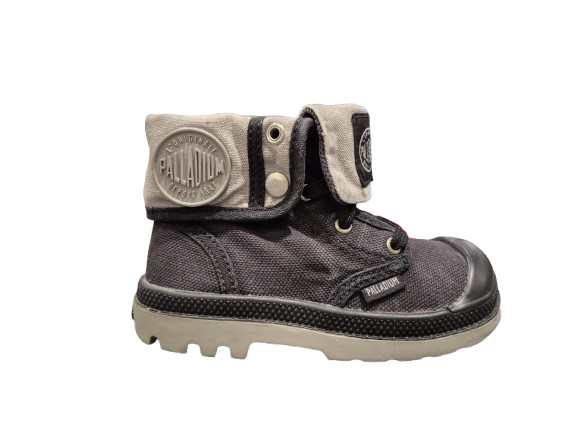 נעלי בראוס האייקוניות מבית מותג הנעליים פלדיום, בצבע שחור/אפור בגרסה מוקטנת לילדים. הנעליים עשויות מקנבס, עם סוליה עבה מגומי שמכסה גם את קצות האצבעות ורוכסן צדדי לנעילה קלה.